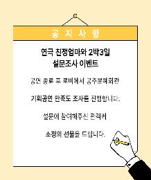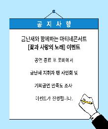 헤더 영역 - 로고, 메뉴, 버튼, 링크 공연 공연안내 예매확인/취소 좌석배치도 공연 알림 신청 대관안내 대관공고 대관시설 대관절차 대관료 대관규정 대관신청 참여마당 공지사항 이벤트 게시판 갤러리 공연영상 고객센터 티켓취소안내 예매방법 공연예절 자주묻는질문 기관소개 인사말 연혁 운영목표 조직과 기구 오시는 길 KOR KOR ENG