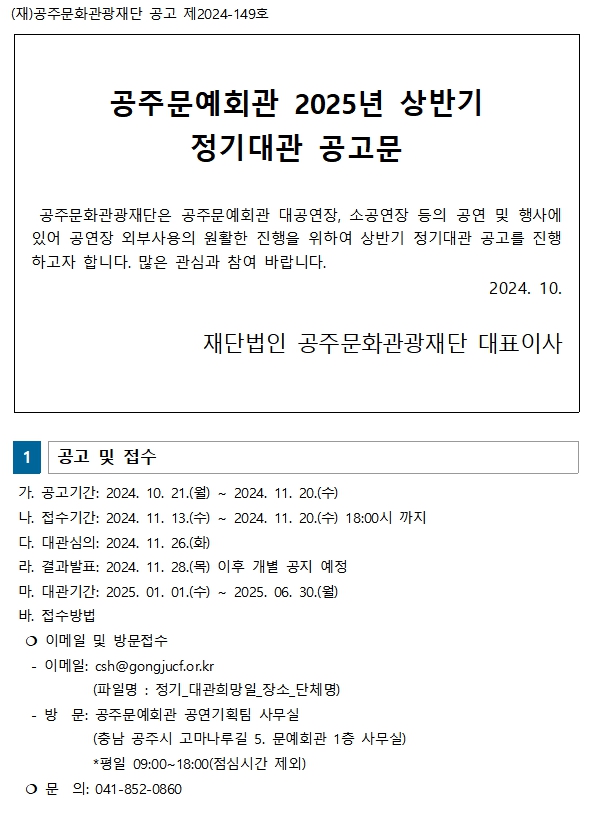 2025년 상반기 공주문예회관 정기대관 공고 등록일 2024.10.18 조회수 1336 공고문_ 2025년도 공주문예회관 상반기 정기대관 공고문.pdf 내려받기 신청서식.hwp 내려받기 시설사용료.pdf 내려받기 공주문예회관 대공연장 극장기술정보.pdf 내려받기 공주문예회관 소공연장 극장기술정보.pdf 내려받기 이전 글 2024년 하반기 공주문예회관 정기대관 공고 다음 글 2025년 상반기 공주문예회관 수시대관 공고 목록