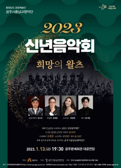 2023 01월 02월 03월 04월 05월 06월 07월 08월 09월 10월 11월 12월 예술단공연 2023 신년음악회 희망의 왈츠 공연일시 2023-01-13 공연시간 19:30 공연장소 대공연장 자세히보기