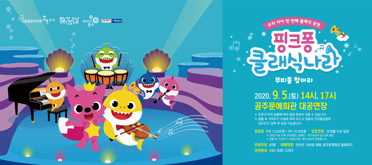 2020 01월 02월 03월 04월 05월 06월 07월 08월 09월 10월 11월 12월 기획공연 핑크퐁 클래식나라 공연일시 2020-09-05 공연시간 14시, 17시 / 2회 공연장소 대공연장 자세히보기 기획공연 연극 보잉보잉 공연일시 2020-09-12 공연시간 15시, 19시 공연장소 대공연장 자세히보기 기획공연 연극 유관순(공주에서 핀 독립의 꽃) 공연일시 2020-09-25 공연시간 19시 공연장소 대공연장 자세히보기