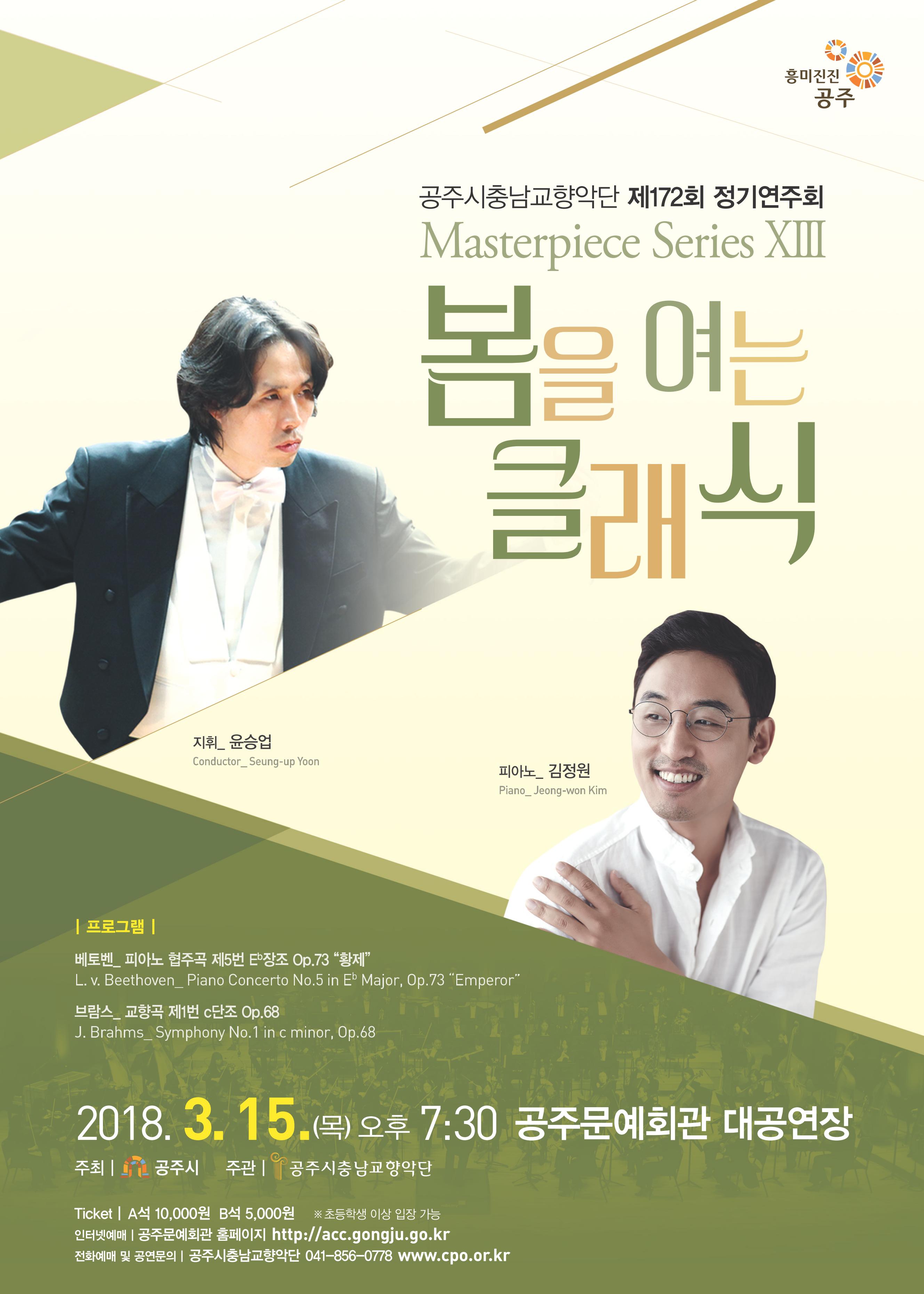 공주시충남교향악단 제172회 정기연주회 마스타피스 시리즈XIII ‘봄을 여는 클래식’ 공연기간2018-03-15 공연예매2018-02-27 15:00 ~ 2018-03-15 15:00 공연시간19:30분 / 100분(휴식시간포함) 공연장소대공연장 티켓정보A석 10,000원, B석 5,000원 관람등급초등생이상 입장가 공연주최공주시충남교향악단 공연문의공주시충남교향악단 041) 856-0778 공지사항 공연소개 프로그램 출연진