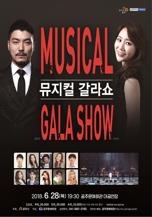 기획공연 뮤지컬 갈라쇼 공연기간2018-06-28 공연예매2018-06-05 15:00 ~ 2018-06-28 15:00 공연시간19:30 / 90분 공연장소대공연장 티켓정보R석:30,000원, S석:20,000원, A석:10,000원 관람등급초등학교이상 관람가 공연주최공주시 문화시설 사업소 공연문의041)840-2180 공지사항 공연소개 프로그램 출연진