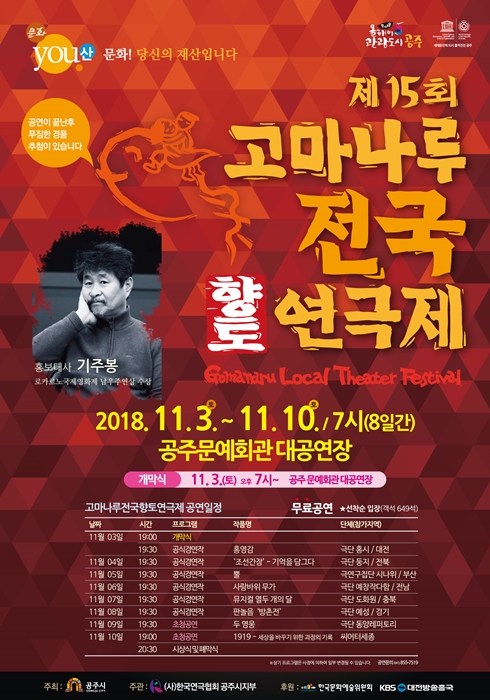 대관공연 제15회 고마나루 전국향토연극제 공연기간2018-11-03 ~ 2018-11-10 공연시간11.3 ~ 9일 : 19:30, 10일:19:00 / 90분 공연장소대공연장 티켓정보전석 무료 관람등급초등생 이상 공연주최(사)한국연극협회 공주시지부 공연문의041)855-7519 공지사항 공연소개 프로그램 출연진