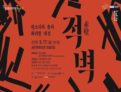 기획공연 적벽 공연기간2019-05-17 공연예매2019-05-03 15:00 ~ 2019-05-17 15:00 공연시간19:30 / 100 공연장소대공연장 티켓정보R석 15,000원, S석 10,000원 ※20인 이상 단체 20%할인, 장애인·국가유공자 등 50% 할인 관람등급초등학생이상 입장 공연주최공주문예회관, 정동극장 공연문의041-840-2203 공지사항 공연소개 프로그램 출연진