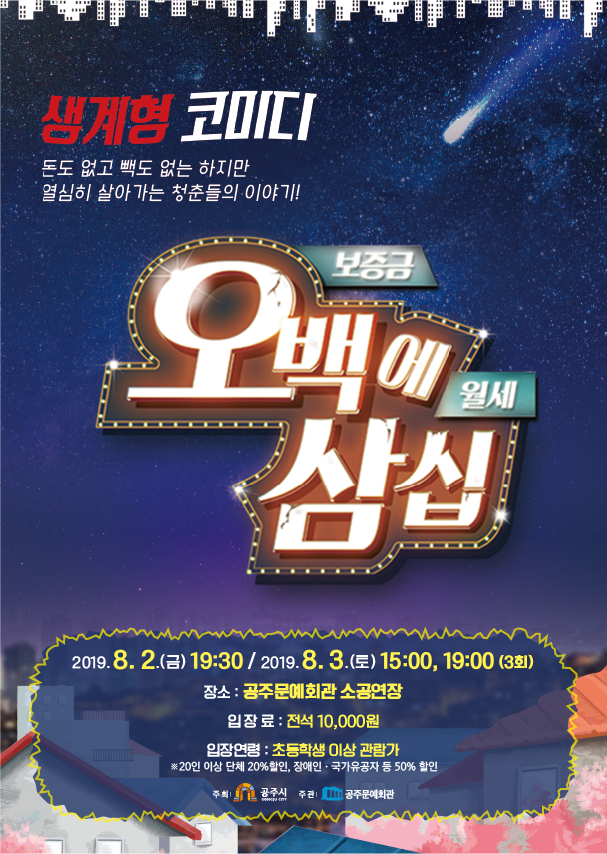 기획공연 연극 '오백에 삼십' 공연기간2019-08-02 ~ 2019-08-03 공연예매2019-07-19 15:00 ~ 2019-08-03 15:00 공연시간8월2일 19:30, 8월3일 15:00, 19:30 / 총 3 / 100분 공연장소소공연장 티켓정보전석 10,000원 관람등급초등학생 이상 공연주최공주문예회관 공연문의041-840-2203 공지사항 공연소개 프로그램 출연진