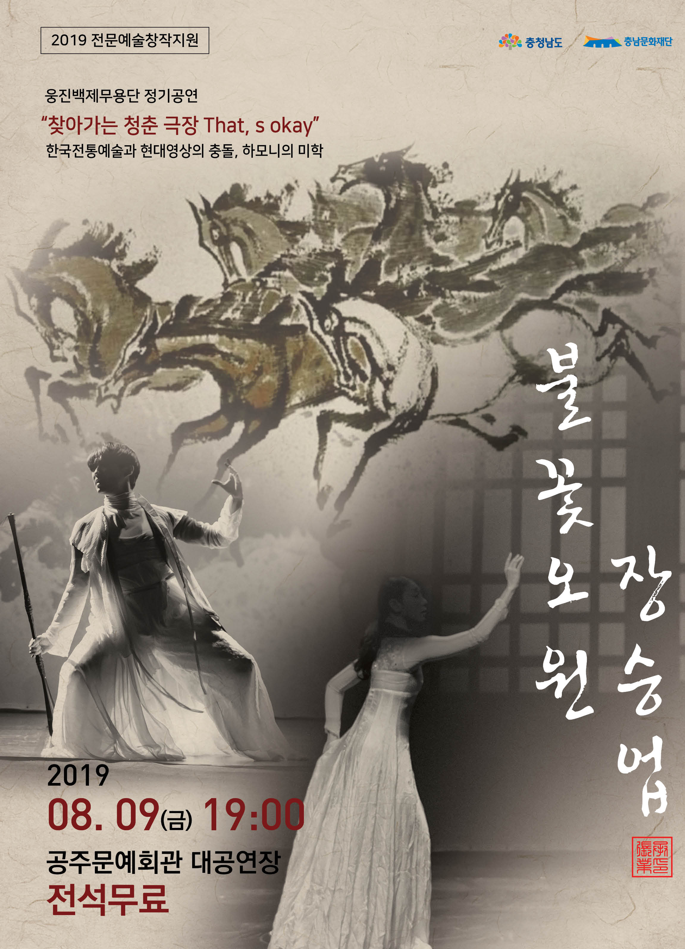 대관공연 불꽃오원 장승업 공연기간2019-08-09 공연시간19:00 / 90 공연장소대공연장 티켓정보전석무료 관람등급초등학생 이상 공연주최웅진백제무용단 공연문의010-2316-5535 공지사항 공연소개 프로그램 출연진