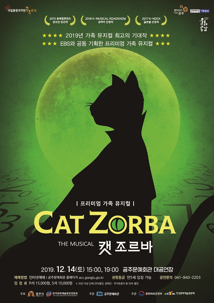 기획공연 가족뮤지컬 '캣 조르바' 공연기간2019-12-14 공연예매2019-11-18 15:00 ~ 2019-12-14 15:00 공연시간15시, 19시 / 90분 공연장소대공연장 티켓정보R석 15,000원, S석 10,000원 / 20인 이상 단체(20%), 장애인 및 국가유공자(50%) 관람등급만 5세 이상 공연주최공주문예회관 공연문의041-840-2203 공지사항 공연소개 프로그램 출연진