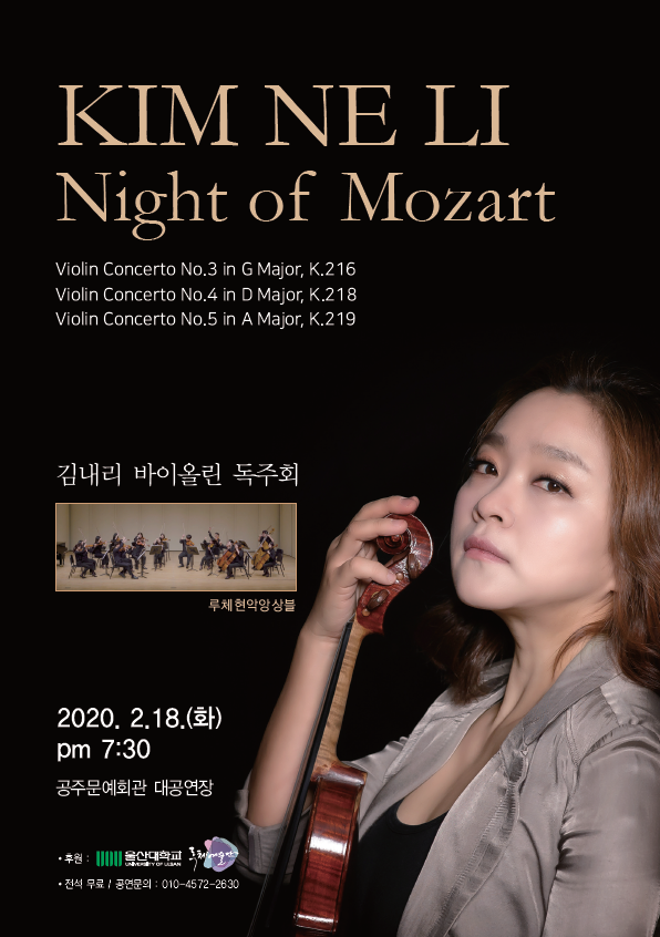 대관공연 김내리 바이올린 독주회 공연기간2020-02-18 공연시간19:30 / 90 공연장소대공연장 티켓정보전석무료 관람등급초등학생 이상 공연주최울산대학교 공연문의010-4572-2630 공지사항 공연소개 프로그램 출연진