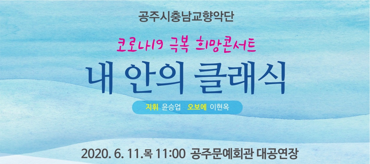 예술단공연 공주시충남교향악단 코로나19 극복 희망콘서트 <내 안의 클래식> ※무관중 콘서트 공연기간2020-06-11 공연시간11:00 공연장소대공연장 티켓정보유튜브에서 흥미진진 공주시를 검색하세요. 관람등급전체관람가 공연주최공주시충남교향악단 공연문의041-856-0778 공지사항 공연소개 프로그램 출연진