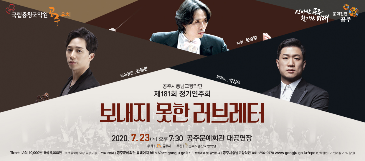 예술단공연 보내지 못한 러브레터 공연기간2020-07-23 공연예매2020-07-08 15:00 ~ 2020-07-23 18:00 공연시간90분 (휴식시간 15분 포함) 공연장소대공연장 티켓정보A석 10,000원, B석 5,000원 관람등급초등학생 이상 공연주최공주시충남교향악단 공연문의041-856-0778 공지사항 공연소개 프로그램 출연진