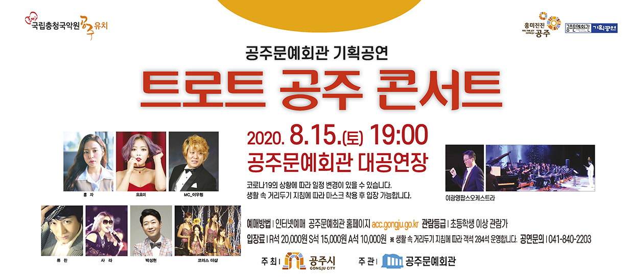 기획공연 트로트 공주 콘서트 공연기간2020-08-15 공연예매2020-07-29 09:00 ~ 2020-08-15 17:00 공연시간100분 공연장소대공연장 티켓정보R석 20,000원, S석 15,000원, A석 10,000원 관람등급초등학생 이상 입장 공연주최공주문예회관 공연문의041-840-2203 공지사항 공연소개 프로그램 출연진