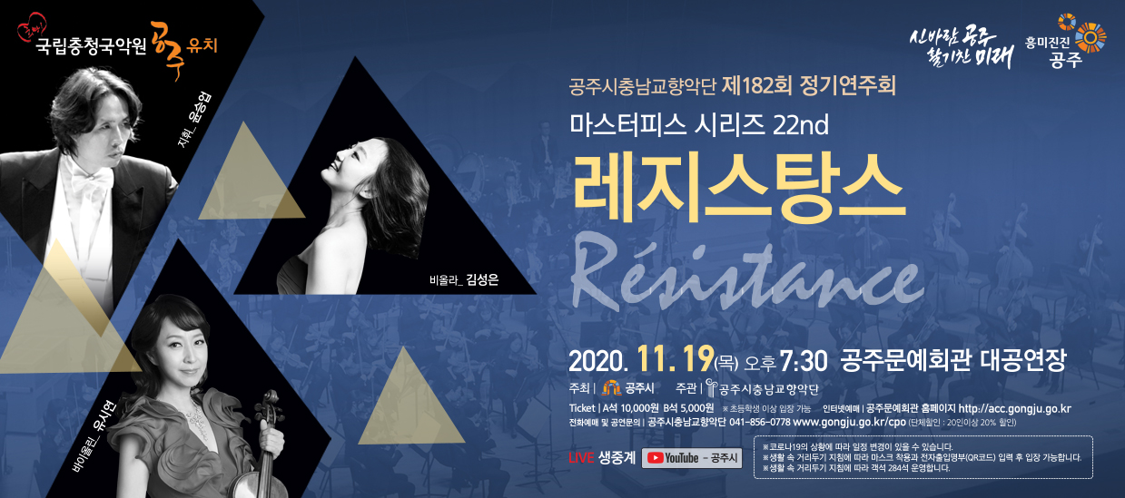 예술단공연 공주시충남교향악단 제182회 정기연주회 <레지스탕스> 공연기간2020-11-19 공연예매2020-11-02 15:00 ~ 2020-11-19 18:00 공연시간90분(휴식시간 15분 포함) 공연장소대공연장 티켓정보A석 10,000원 B석 5,000원 관람등급초등학생 이상 관람가능 공연주최공주시충남교향악단 공연문의041-856-0778 공지사항 공연소개 프로그램 출연진