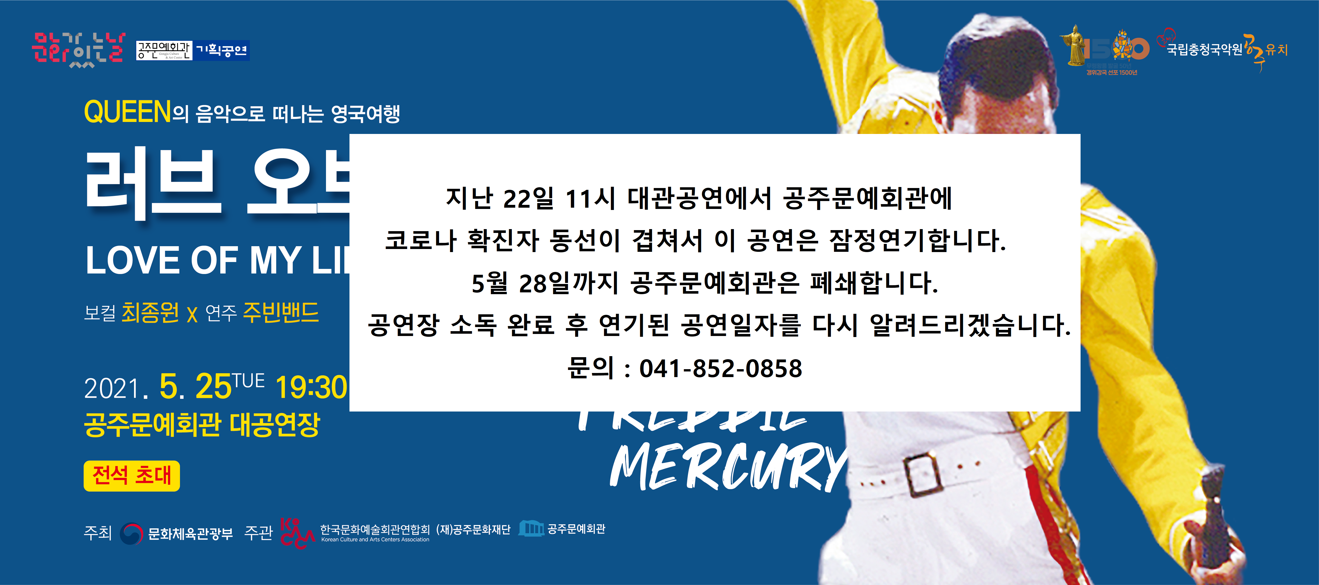 기획공연 [문화가 있는 날] 러브 오브 마이 라이프 공연기간2021-05-25 공연예매2021-05-06 14:00 ~ 2021-05-25 18:00 공연시간19:30 공연장소대공연장 티켓정보전석 초대 관람등급초등학생 이상 입장 가능 공연주최한국문화예술회관연합회, 공주문화재단ㆍ공주문예회관 공연문의041-852-0858 공지사항 공연소개 프로그램 출연진