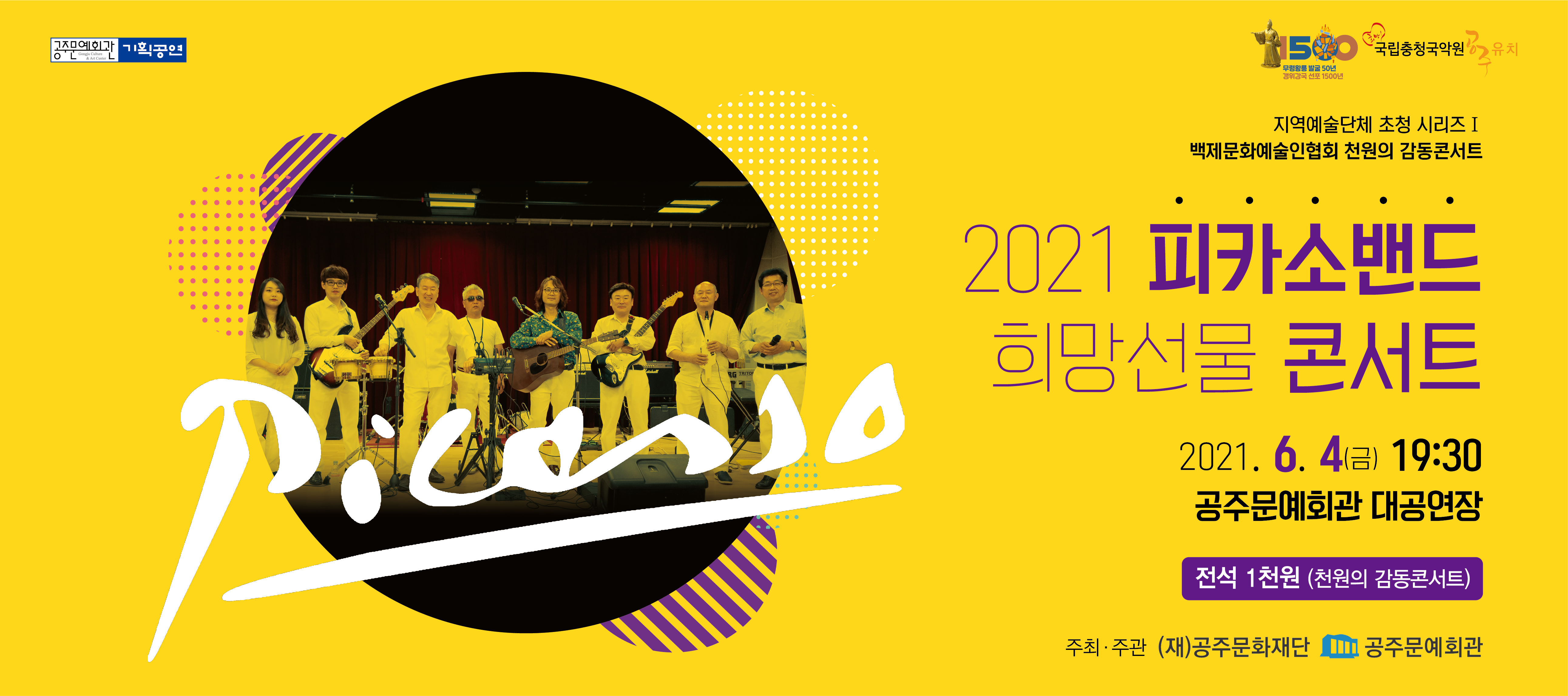 기획공연 2021 피카소밴드 희망선물 콘서트 공연기간2021-06-04 공연예매2021-05-20 17:00 ~ 2021-06-04 18:00 공연시간19:30 공연장소대공연장 티켓정보전석 1천원 관람등급초등학생 이상 입장 가능 공연주최공주문화재단ㆍ공주문예회관 공연문의041)852-0858 공지사항 공연소개 프로그램 출연진