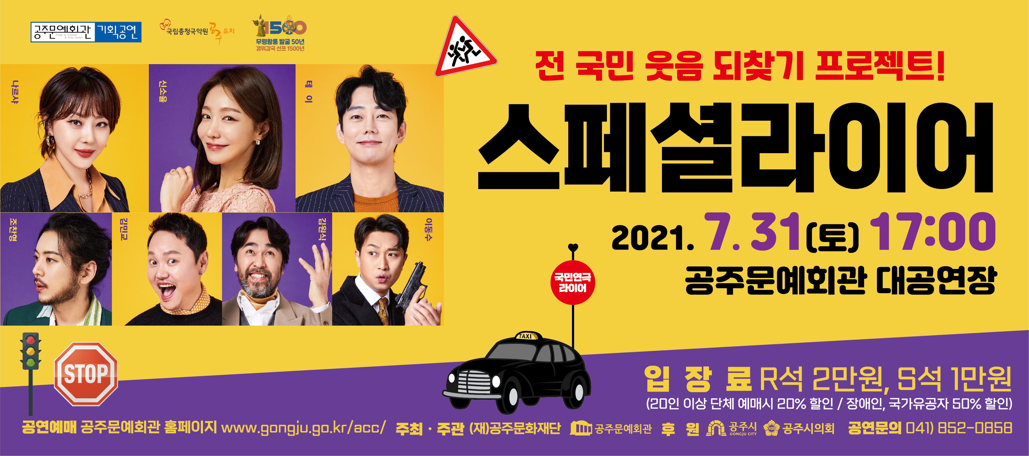 기획공연 [기획] 스페셜 라이어 공연기간2021-07-31 공연예매2021-07-06 14:00 ~ 2021-07-31 17:00 공연시간17:00 공연장소대공연장 티켓정보R석 2만원, S석 1만원 (단체20%, 복지50% 할인) 관람등급초등학생 이상 입장 가능 공연주최공주문화재단ㆍ공주문예회관 공연문의041-852-0858 공지사항 공연소개 프로그램 출연진
