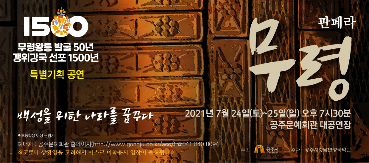 예술단공연 판페라 무령 - 백성을 위한 나라를 꿈꾸다 공연기간2021-07-24 ~ 2021-07-25 공연예매2021-07-15 15:00 ~ 2021-07-24 18:00 공연시간19:30 공연장소대공연장 티켓정보R석 3만원, S석 2만원, A석 1만원 (단체20%, 복지50% 할인) 관람등급초등학생 이상 입장 가능 공연주최충남연정국악단 공연문의041-840-8094 공지사항 공연소개 프로그램 출연진
