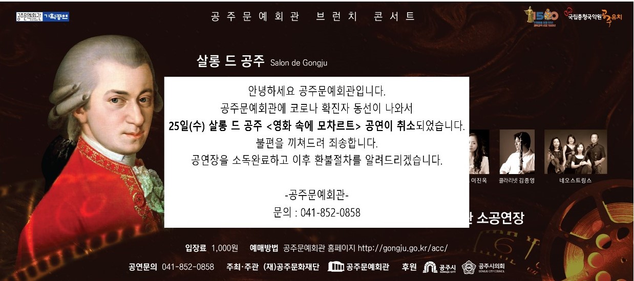 기획공연 [살롱 드 공주] 영화 속의 모차르트 공연기간2021-08-25 공연예매2021-07-27 14:00 ~ 2021-08-25 10:00 공연시간11:00 공연장소소공연장 티켓정보전석 1,000원 관람등급초등학생 이상 입장 가능 공연주최공주문화재단ㆍ공주문예회관 공연문의041) 852-0858 공지사항 공연소개 프로그램 출연진