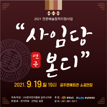 대관공연 [대관] 연극 - 사임당 본디 공연기간2021-09-19 공연시간19:00 공연장소소공연장 티켓정보무료, 선착순입장 공연주최(사)한국연극협회 공주시지부 공연문의041-881-9311 공지사항 공연소개 프로그램 출연진