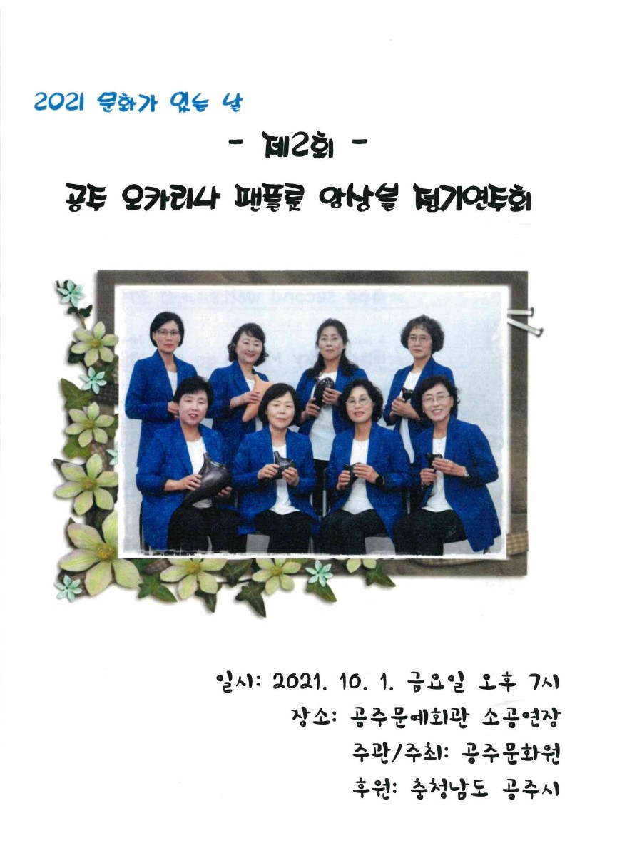 대관공연 [대관] 공주 오카리나 앙상블 정기연주회 공연기간2021-10-01 공연시간19:00 공연장소소공연장 티켓정보전석 초대 관람등급36개월 이상 입장가능 공지사항 공연소개 프로그램 출연진