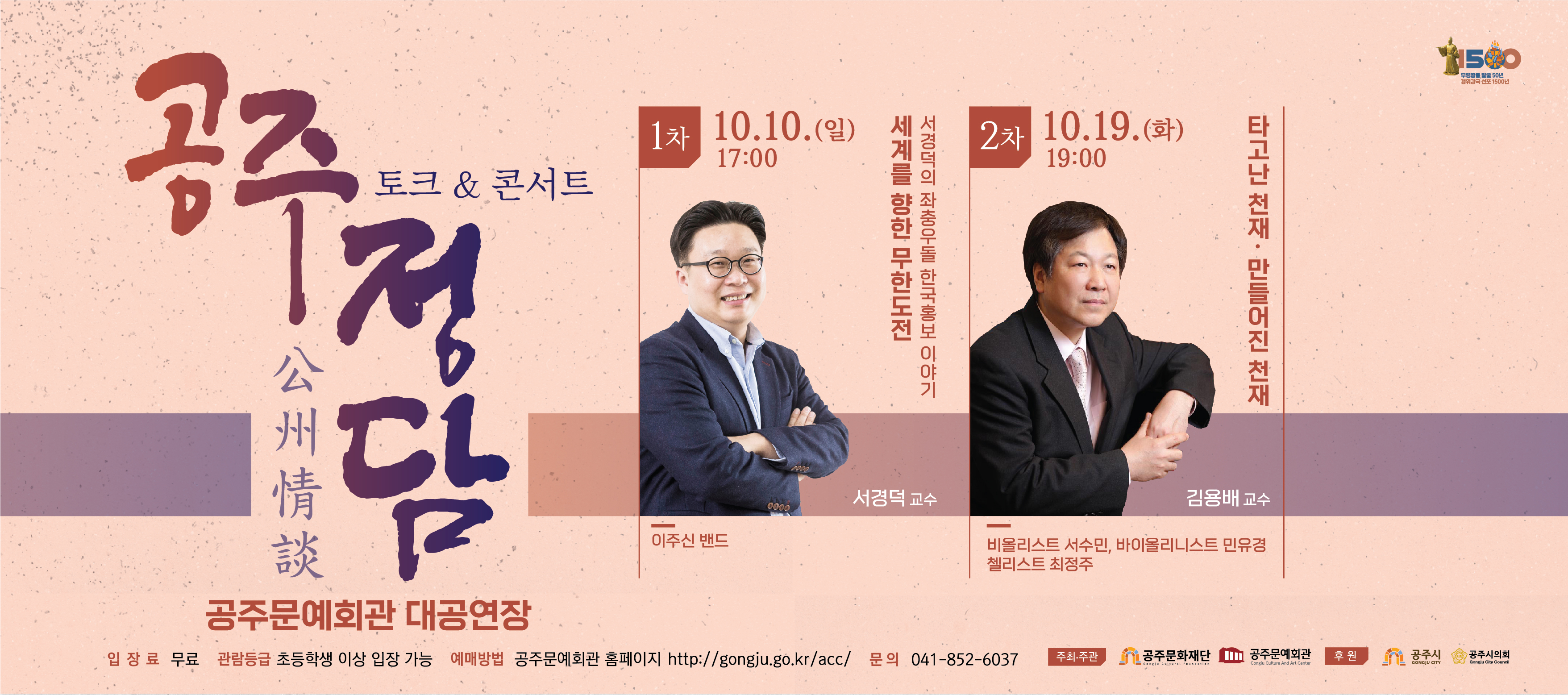 기획공연 [대관] 인문학 콘서트 <공주정담(公州情談)> 공연기간2021-10-10 공연예매2021-10-01 14:00 ~ 2021-10-10 17:00 공연시간17:00 공연장소대공연장 티켓정보전석 초대 관람등급초등학생 이상 입장 가능 공연주최공주문화재단 공연문의041-852-6037 공지사항 공연소개 프로그램 출연진