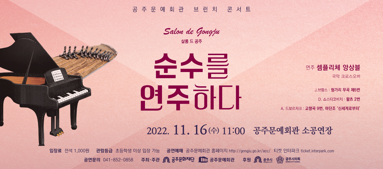 기획공연 살롱 드 공주 - 순수를 연주하다 공연기간2022-11-16 공연예매2022-10-18 13:00 ~ 2022-11-15 17:00 공연시간11:00 공연장소소공연장 티켓정보전좌석 1,000원 관람등급초등학생 이상 가능 공연주최공주문예회관 공연문의041-852-0858 공지사항 공연소개 프로그램 출연진