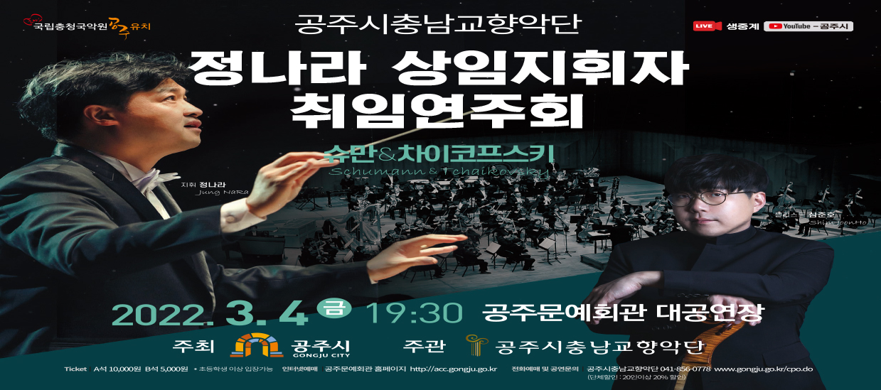 예술단공연 공주시충남교향악단 정나라 상임지휘자 취임연주회 'Schumann & Tchaikovsky'(슈만 & 차이코프스키) 공연기간2022-03-04 공연시간19:30 공연장소대공연장 공연주최공주시충남교향악단 공연문의041-856-0778 공지사항 공연소개 프로그램 출연진