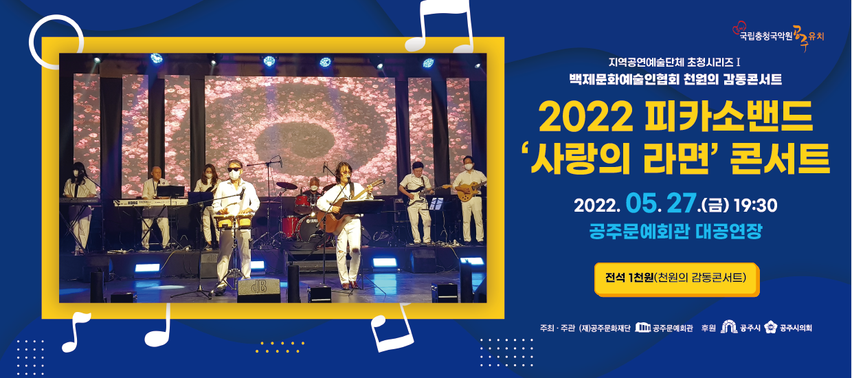 기획공연 2022 피카소밴드 '사랑의 라면' 콘서트 공연기간2022-05-27 공연예매2022-04-28 13:00 ~ 2022-05-27 20:00 공연시간19:30 공연장소대공연장 티켓정보전석 1,000원 관람등급초등학생 이상 입장가능 공연주최공주문화재단·공주문예회관 공연문의041-852-0858 공지사항 공연소개 프로그램 출연진