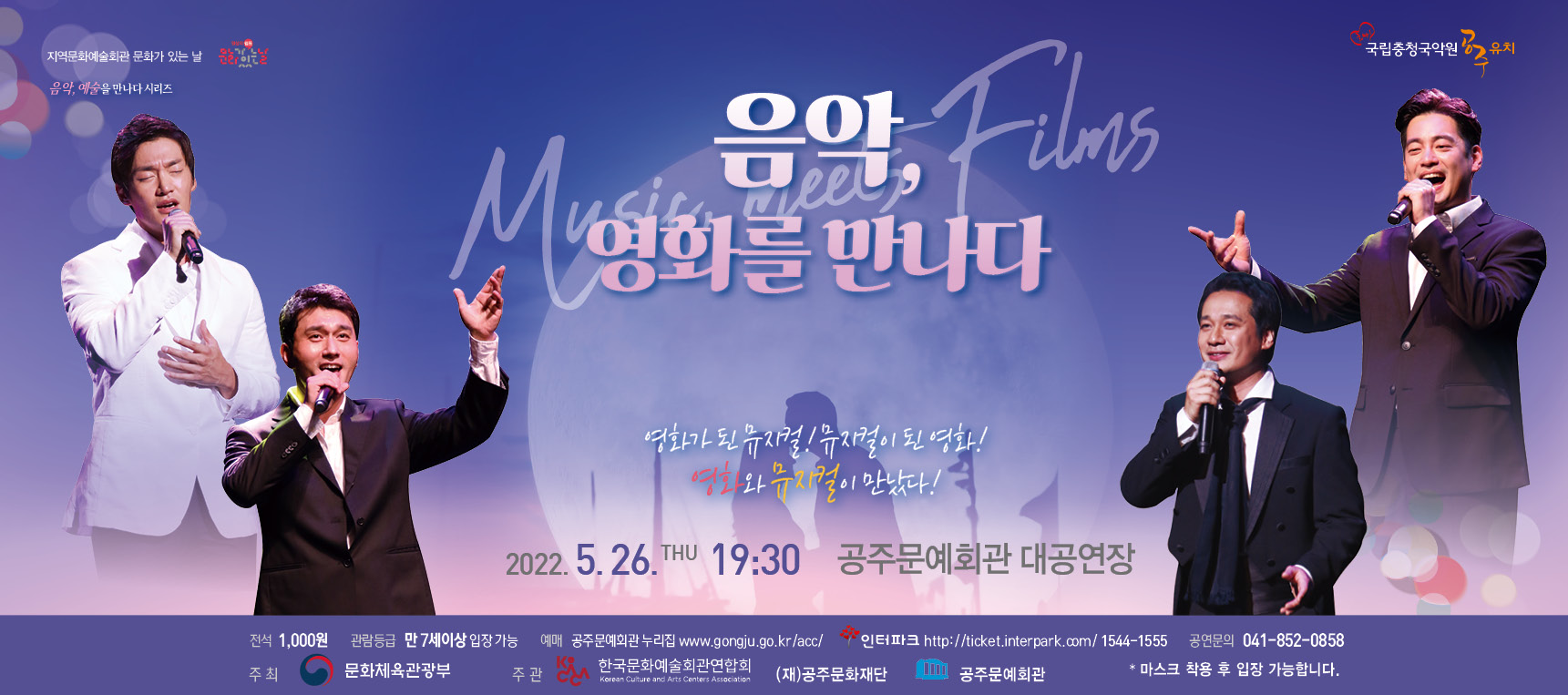 기획공연 [문화가 있는 날]음악,영화를 만나다 공연기간2022-05-26 공연예매2022-04-29 13:00 ~ 2022-05-26 20:00 공연시간19:30 공연장소대공연장 티켓정보전석 1,000원 관람등급초등학생 이상 입장 가능 공연주최공주문화재단, 공주문예회관 공연문의041-852-0858 공지사항 공연소개 프로그램 출연진