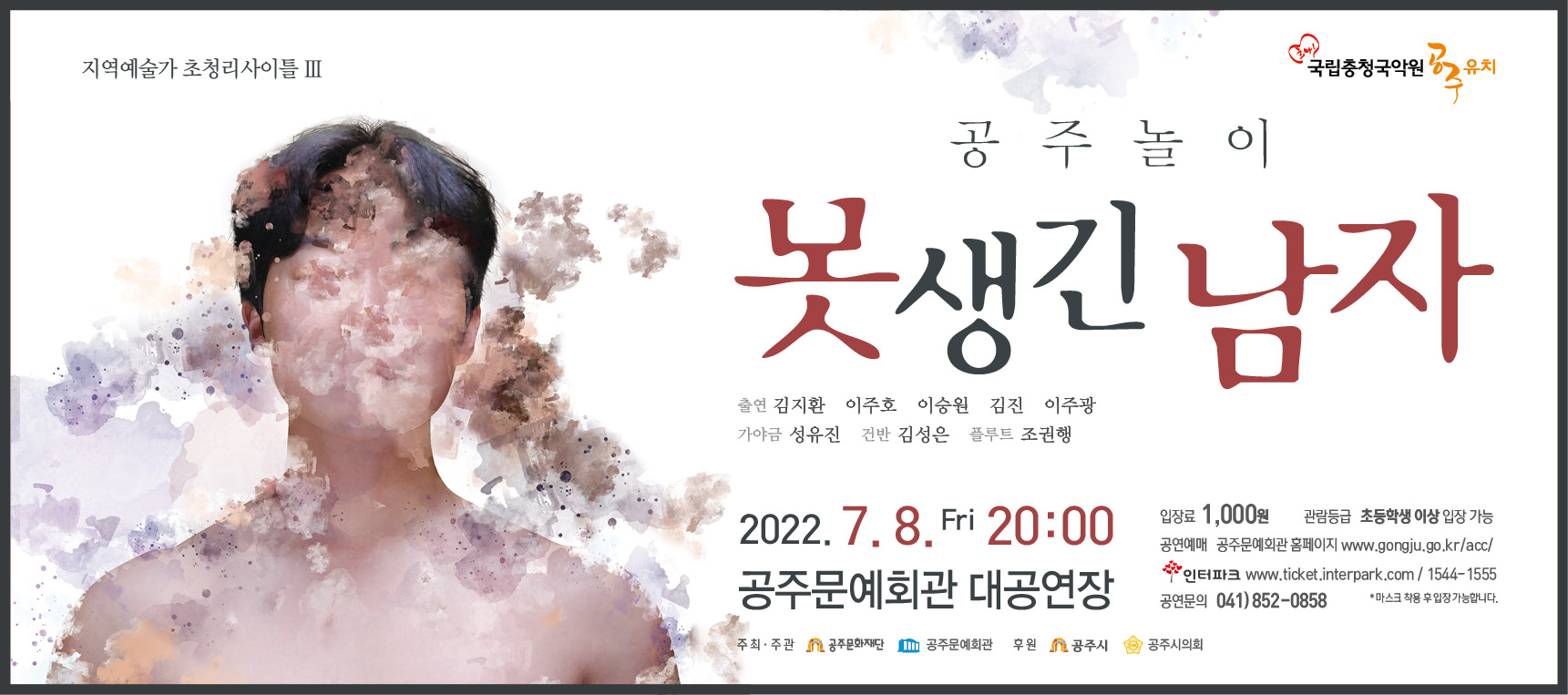 기획공연 지역예술가 초청리사이틀III 김지환<못생긴 남자> 공연기간2022-07-08 공연예매2022-06-08 11:00 ~ 2022-07-07 17:00 공연시간20:00 공연장소대공연장 티켓정보전석 1,000원 관람등급초등학생 이상 입장 가능 공연주최공주문화재단 공주문예회관 공연문의041-852-0858 공지사항 공연소개 프로그램 출연진