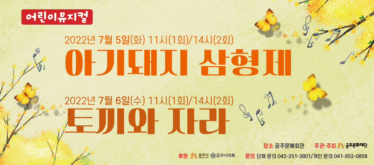 기획공연 어린이 뮤지컬 <아기돼지 삼형제, 토끼와 자라> 공연기간2022-07-05 ~ 2022-07-06 공연시간7월 5일(화) 11시(1회)/14시(2회), 7월 6일(수) 11시(1회)/14시(2회) 공연장소대공연장 티켓정보전석 무료 관람등급36개월 이상 입장 가능 공연주최공주문화재단 공주문예회관 공연문의041-852-0858 공지사항 공연소개 프로그램 출연진
