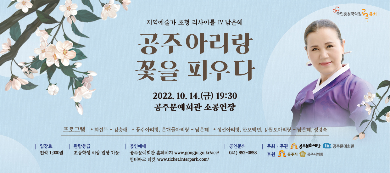 기획공연 지역예술가 남은혜 초청리사이틀 '공주아리랑 꽃을 피우다' 공연기간2022-10-14 공연예매2022-09-13 13:00 ~ 2022-10-13 17:00 공연시간19:30 공연장소소공연장 티켓정보1,000원 관람등급초등학생 이상 입장 가능 공연주최공주문화재단 공주문예회관 공연문의041-852-0858 공지사항 공연소개 프로그램 출연진