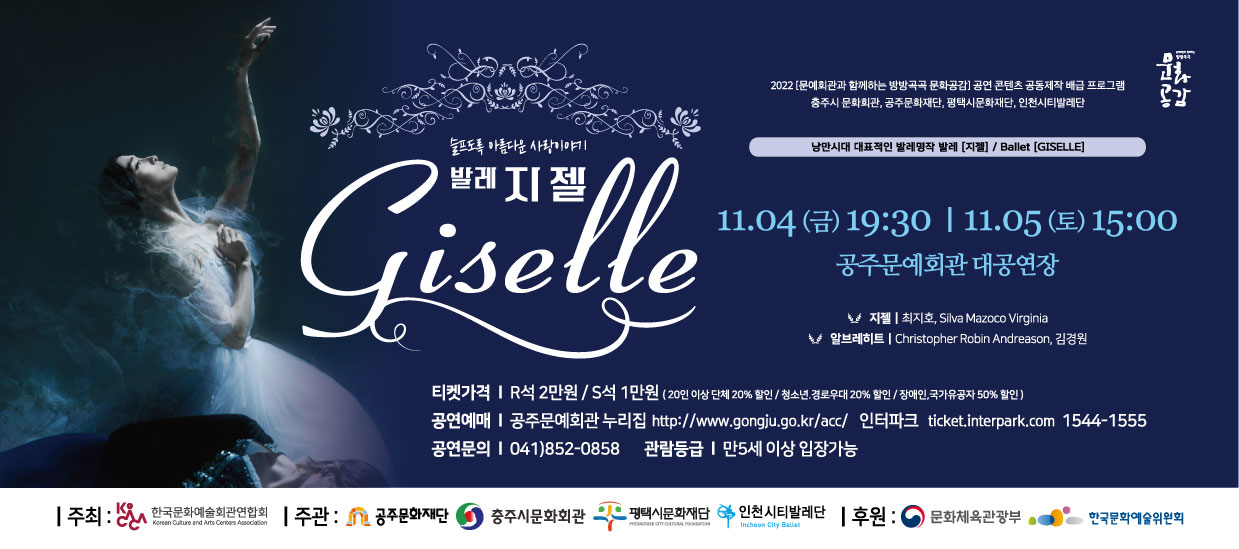 기획공연 발레 <지젤> 공연기간2022-11-04 ~ 2022-11-05 공연예매2022-09-14 13:00 ~ 2022-11-05 17:00 공연시간11. 4(금)19:30, 11. 5(토)15:00 공연장소대공연장 티켓정보R석 2만원, S석 1만원 관람등급5세 이상 입장 가능 공연주최공주문화재단,충주시문화회관,평택시문화재단,인천시티발레단 공연문의041-852-0858 공지사항 공연소개 프로그램 출연진