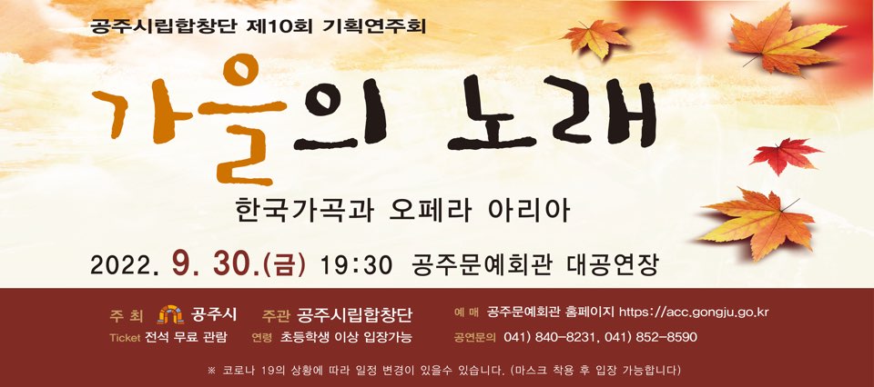 예술단공연 공주시립합창단 제 10회 기획연주회<가을의 노래> 공연기간2022-09-30 공연예매2022-09-19 10:00 ~ 2022-09-29 17:00 공연시간19:30 공연장소대공연장 티켓정보전석 무료 관람등급초등학생 이상 입장 가능 공연문의041-852-8590 공지사항 공연소개 프로그램 출연진