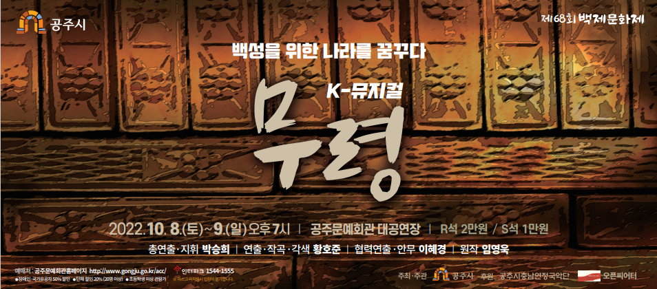 예술단공연 K-뮤지컬 무령 공연기간2022-10-08 ~ 2022-10-09 공연예매2022-09-29 13:00 ~ 2022-10-09 17:00 공연시간19:00 공연장소대공연장 티켓정보R석 2만원 S석 1만원 관람등급초등학생 이상 입장 가능 공연주최공주시 공지사항 공연소개 프로그램 출연진