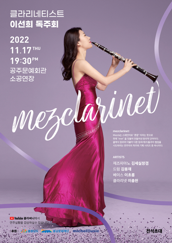 대관공연 클라리네티스트 이선희 Mezclarinet 공연기간2022-11-17 공연시간19:30 공연장소소공연장 티켓정보전석 초대 관람등급초등학생 이상 입장 가능 공연주최충남문화재단 공지사항 공연소개 프로그램 출연진