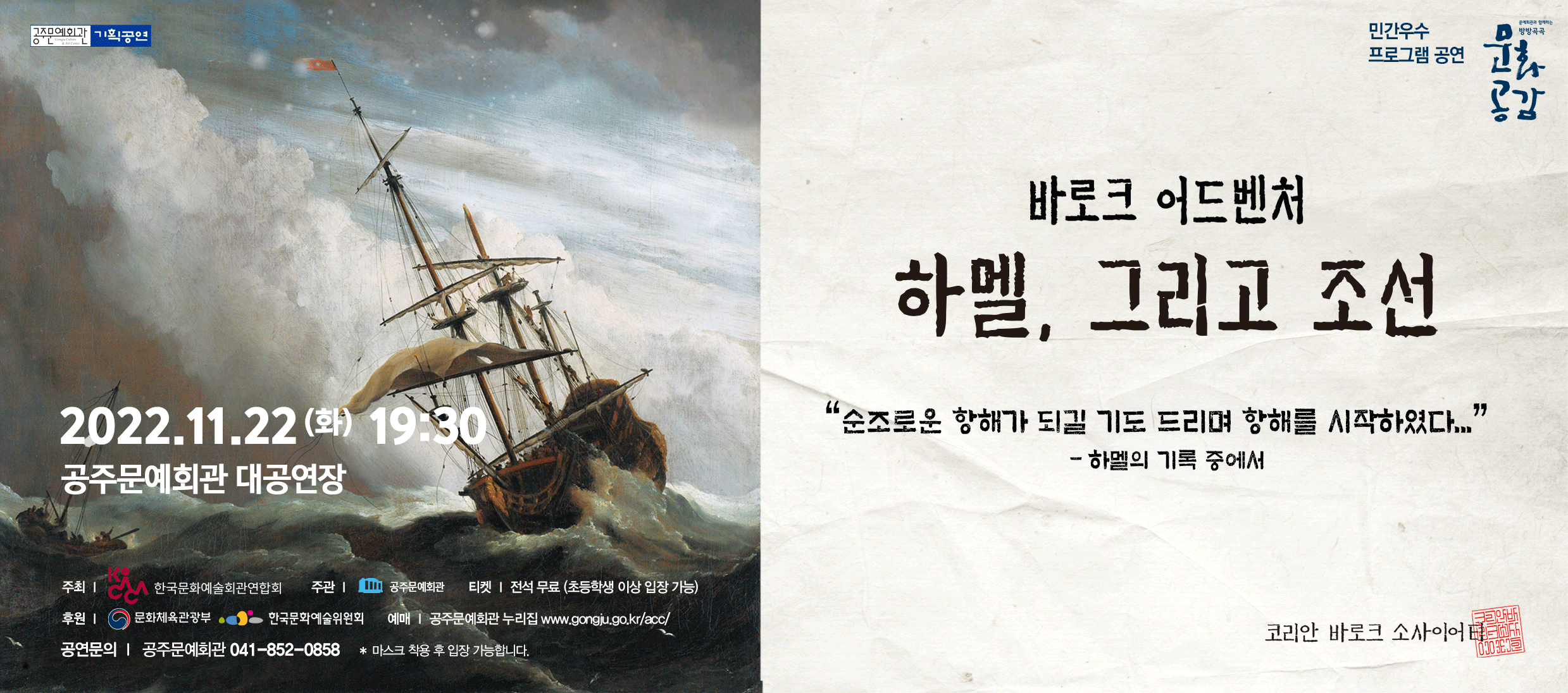 기획공연 바로크 어드벤처-하멜, 그리고 조선 공연기간2022-11-22 공연예매2022-11-04 12:00 ~ 2022-11-21 17:00 공연시간19:30 공연장소대공연장 티켓정보전석 무료 관람등급초등학생 이상 입장 가능 공연문의041-852-0858 공지사항 공연소개 프로그램 출연진