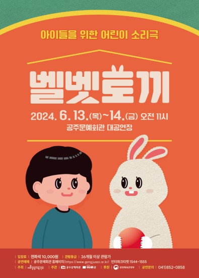 기획공연 어린이 소리극 <벨벳토끼> 공연기간2024-06-13 ~ 2024-06-14 공연예매2024-05-20 14:00 ~ 2024-06-13 17:00 공연시간11:00 공연장소대공연장 티켓정보전좌석 10,000원 관람등급36개월 이상 관람가 공연주최주최: 예술경영지원센터 주관: 공주문예회관/타루 후원: 문화체육관광부 공연문의041-852-0858 공지사항 공연소개 프로그램 출연진