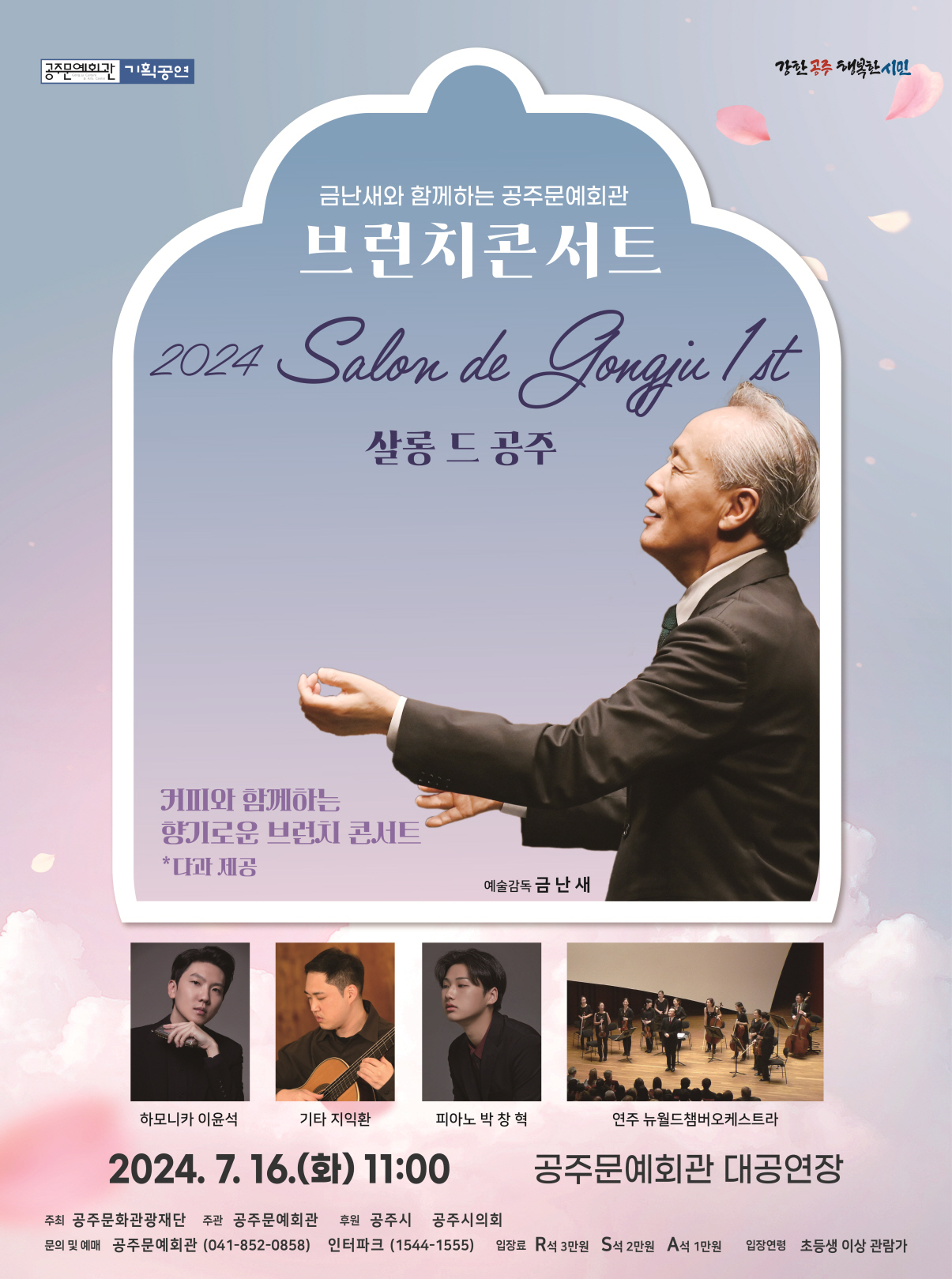 기획공연 금난새와 함께하는 브런치 콘서트 <살롱 드 공주> 공연기간2024-07-16 공연예매2024-06-17 14:00 ~ 2024-07-15 17:00 공연시간11:00 공연장소대공연장 티켓정보R석 3만원, S석 2만원, A석 1만원 관람등급만 7세 이상 관람가 공연주최공주문화관광재단 공연문의041-852-0858 공지사항 공연소개 프로그램 출연진