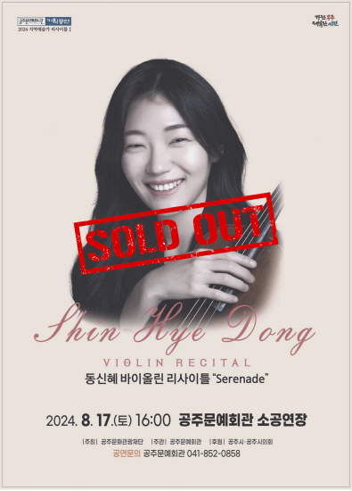 기획공연 지역예술가 리사이틀I 동신혜 바이올린 리사이틀 공연기간2024-08-17 공연시간16:00 공연장소소공연장 티켓정보전석 1,000원 관람등급만 7세 이상 공연주최공주문예회관 공연문의041-852-0858 공지사항 공연소개 프로그램 출연진