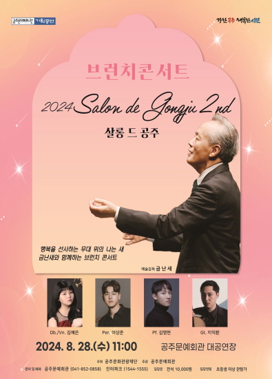 기획공연 금난새와 함께하는 브런치 콘서트Ⅱ <살롱 드 공주> 공연기간2024-08-28 공연시간11:00 공연장소대공연장 티켓정보전석 10,000원 관람등급만 7세 이상 관람가 공연주최공주문화관광재단 공연문의041-852-0858 공지사항 공연소개 프로그램 출연진