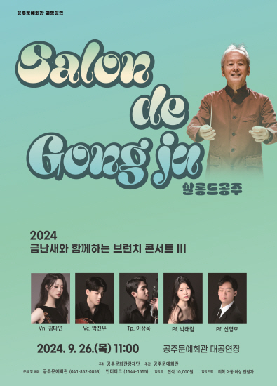 기획공연 금난새와 함께하는 브런치 콘서트III <살롱 드 공주> 공연기간2024-09-26 공연시간11:00 공연장소대공연장 티켓정보전석 10,000원 관람등급만 7세 이상 관람가 공연주최공주문화관광재단 공연문의041-852-0858 공지사항 공연소개 프로그램 출연진