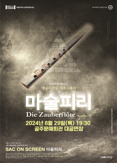 기획공연 영상으로 만나는 오페라 <마술피리> 공연기간2024-08-29 공연시간19:30 공연장소대공연장 티켓정보전석 무료 공연주최주최주관: 공주문예회관, 후원: 예술의전당 공연문의041-852-0858 공지사항 공연소개 프로그램 출연진