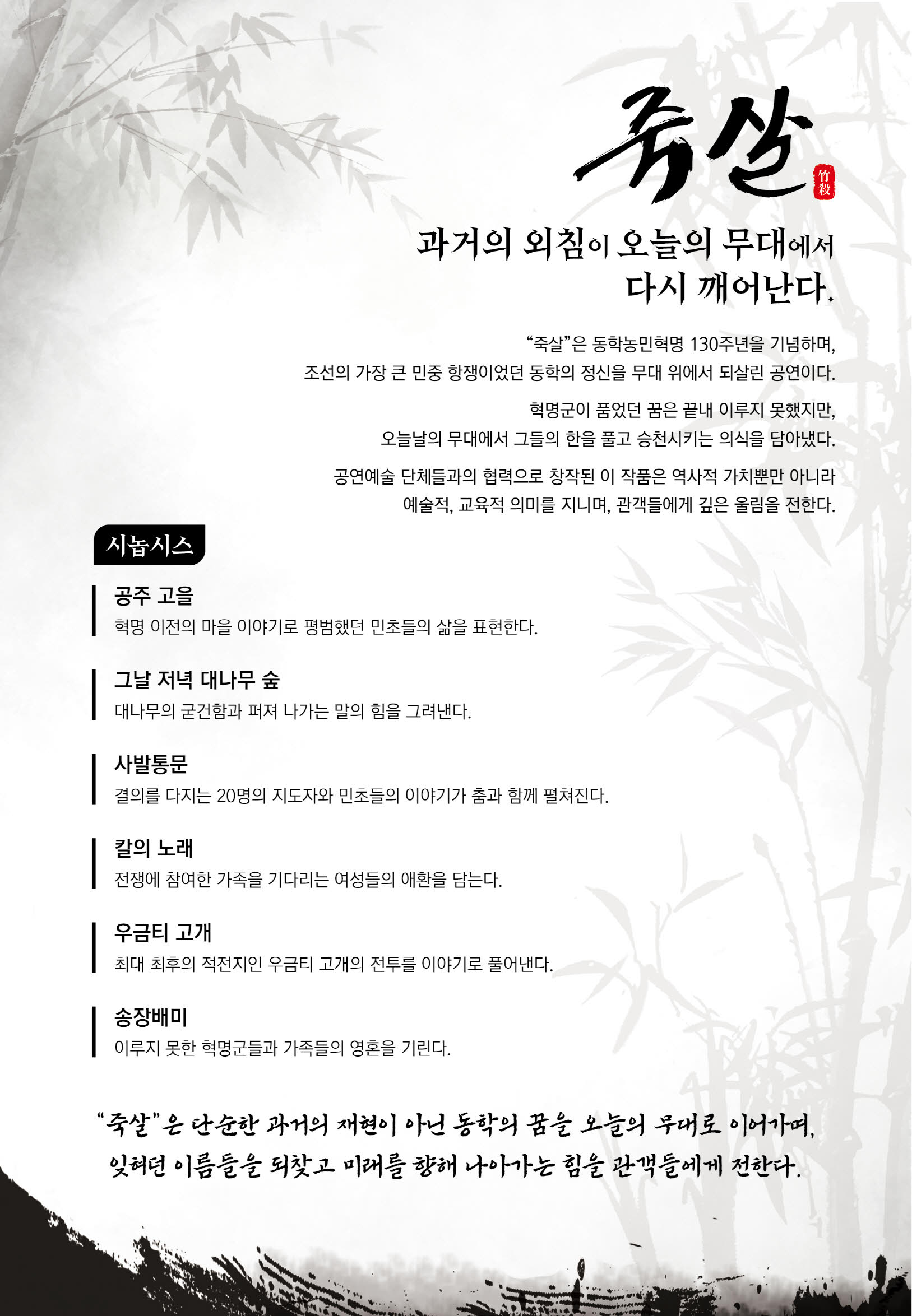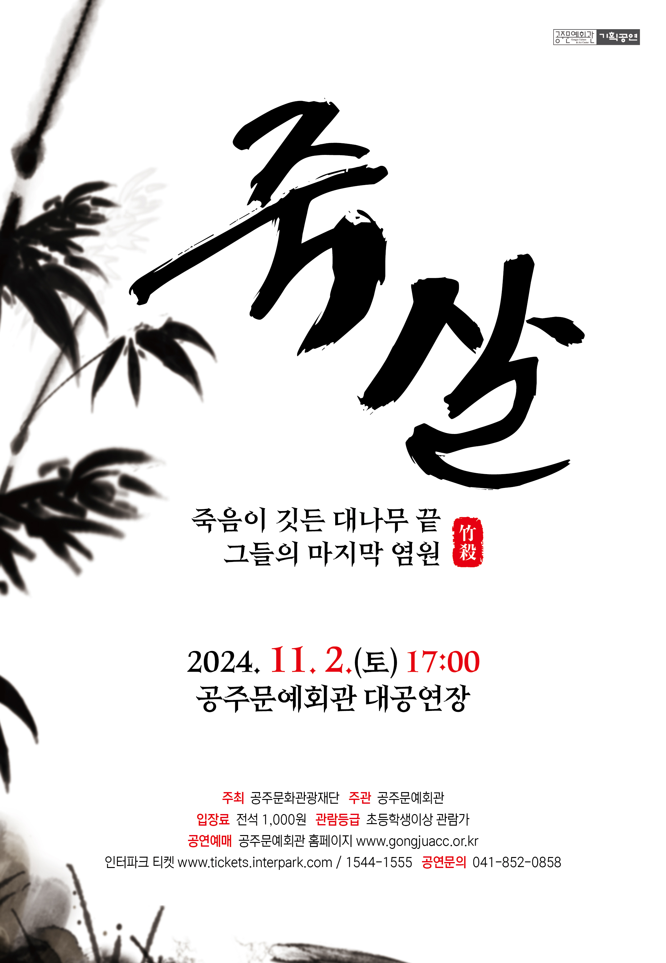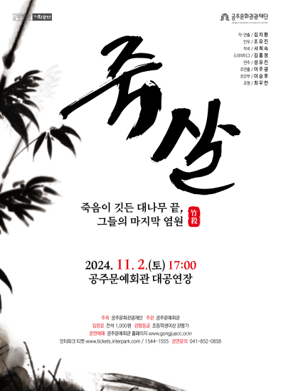 기획공연 지역공연예술단체 <죽살> 공연기간2024-11-02 공연시간17:00 공연장소대공연장 티켓정보전석 1,000원 관람등급취학 아동 이상 관람가 공연주최주최: 공주문화관광재단 주관: 공주문예회관 공지사항 공연소개 프로그램 출연진 공연시간: 70분 (예정) 무용수 1. 조유진 2. 박혜정 3. 정혜경 4. 신하늘 5. 한서영 6. 이승후 7. 임규성 8. 김민혁 9. 김승환 배우 1. 김지환 2. 오완우 3. 최희도 4. 이수현 5. 정선아 6. 박현숙 7. 이주광 8. 서영진 9. 장희정 10. 장현호 11. 위환