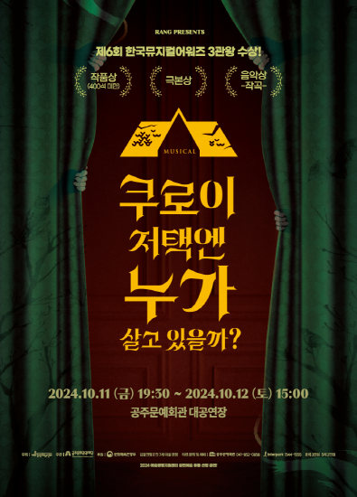 기획공연 뮤지컬 <쿠로이 저택엔 누가 살고 있을까?> 공연기간2024-10-11 ~ 2024-10-12 공연예매2024-08-27 14:00 ~ 2024-10-11 17:00 공연시간/ [11일(금) 19:30, 12일(토) 15:00] 공연장소대공연장 티켓정보R석 30,000원, S석 20,000원 관람등급만 7세 이상 공연주최공주문예회관 공연문의041-852-0858 공지사항 공연소개 프로그램 출연진