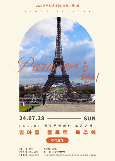대관공연 임아름 플루트 독주회Ⅰ - <파리에서 온 편지> 공연기간2024-07-28 공연시간17:00 공연장소소공연장 티켓정보전석 무료 공연주최주최·주관: 임아름 후원: 공주문화관광재단 공연문의010-8203-3884 공지사항 공연소개 프로그램 출연진