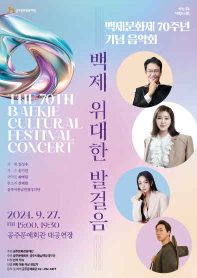 기획공연 백제문화제 70주년 기념 음악회 <백제 위대한 발걸음> 공연기간2024-09-27 공연예매2024-08-23 10:00 ~ 2024-09-26 17:00 공연시간15:00, 19:30 공연장소대공연장 티켓정보전석 무료 관람등급취학 아동 이상 관람가 공연주최주최: 공주문화관광재단 주관: 공주문예회관, 공주시충남연정국악단 공연문의041-852-6057 공지사항 공연소개 프로그램 출연진