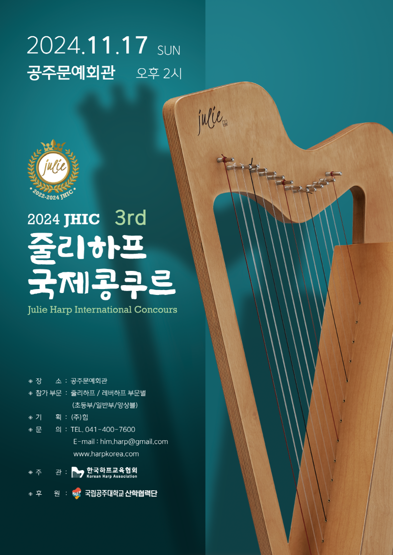 대관공연 줄리하프 코리아 국제 콩쿠르 공연기간2024-11-17 공연시간14:00 공연장소대공연장 관람등급,041-400-7600 공연주최주관: 한국하프교육협회 공지사항 공연소개 프로그램 출연진