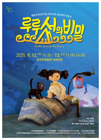 기획공연 인형극 [루루섬의 비밀] 공연기간2025-09-12 ~ 2025-09-13 공연예매2025-01-24 10:00 ~ 2025-09-12 17:00 공연시간12.(금) 10:30, 13.(토) 11:00, 14:00 공연장소대공연장 티켓정보R석 20,000원, S석 10,000원 소요시간55분 관람등급36개월 이상 공연주최공주문화관광재단 공연주관공주문예회관 공연장르인형극 공연문의041-852-0858 할인정보장애인 1~3급(중증/동반1인)50% 장애인 4~6급(경증/본인만)50% 국가유공자 및 의상자(1~2급/동반1인)50% 특수임무유공자(본인만)50% 독립유공자(본인만)50% 경로(만65세이상/본인만)30% 청소년(만9세~만24세이하/본인만)30% 아동(36개월~만8세이하/본인만)30% 20인 이상 단체50% *문화누리카드 결제 가능합니다. 공지사항 공연소개 프로그램 출연진 시놉시스