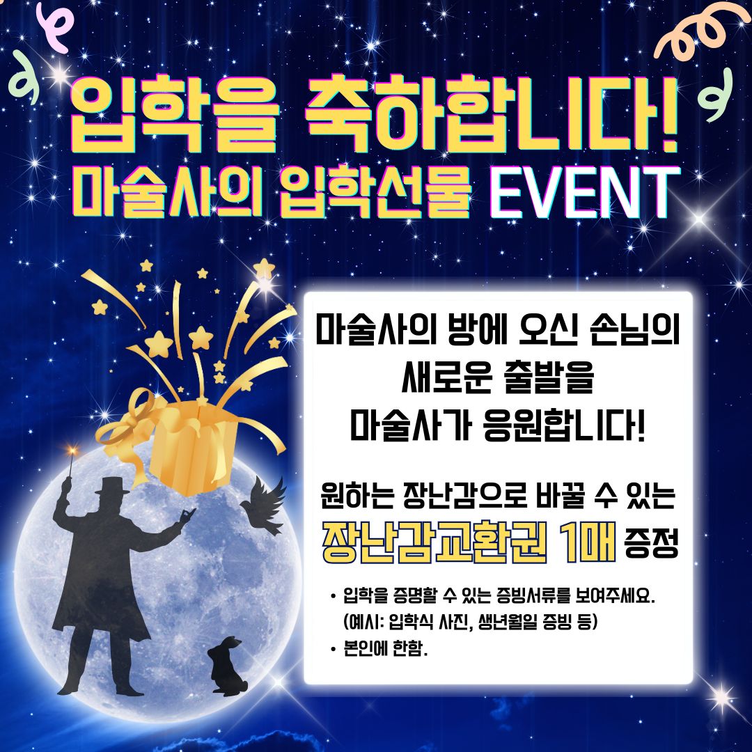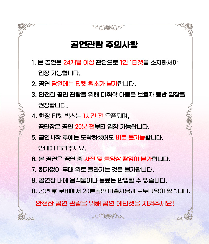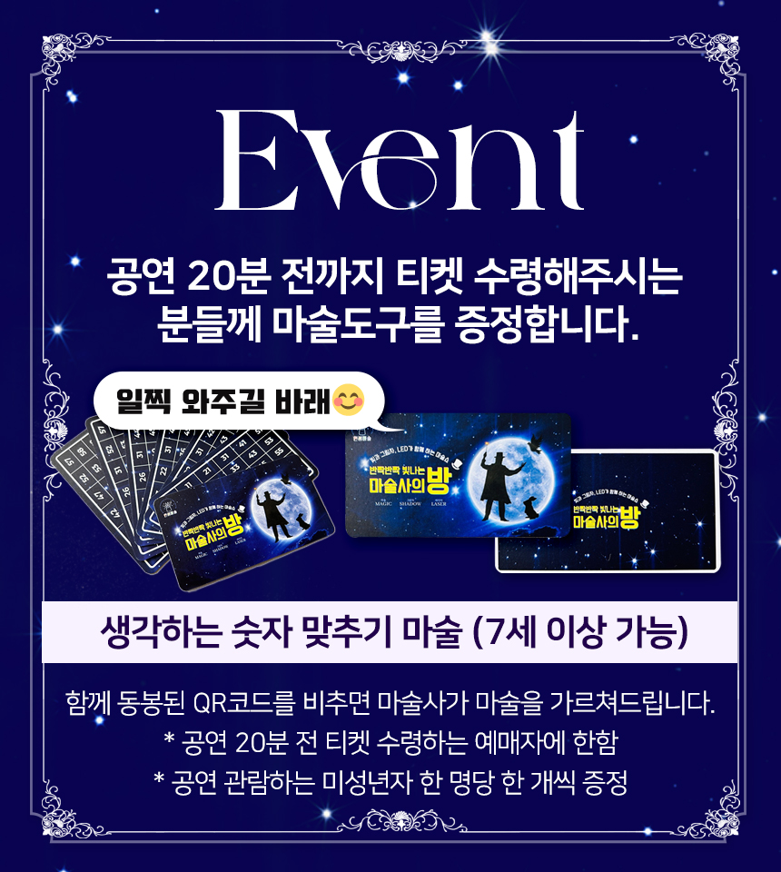 대관공연 반짝반짝 빛나는 마술사의 방 공연기간2025-03-29 공연시간13:00 / 15:00 공연장소대공연장 티켓정보30,000 소요시간55분 공연주최반달컴퍼니 공연주관인생마술 공연장르마술 공연문의010-3013-4643 할인정보예매할인 22,000원 장애인 및 국가유공자 할인 15,000원 공지사항 공연소개 프로그램 출연진 * 본 공연은 단체측 사정에 의해 변경될 수 있습니다