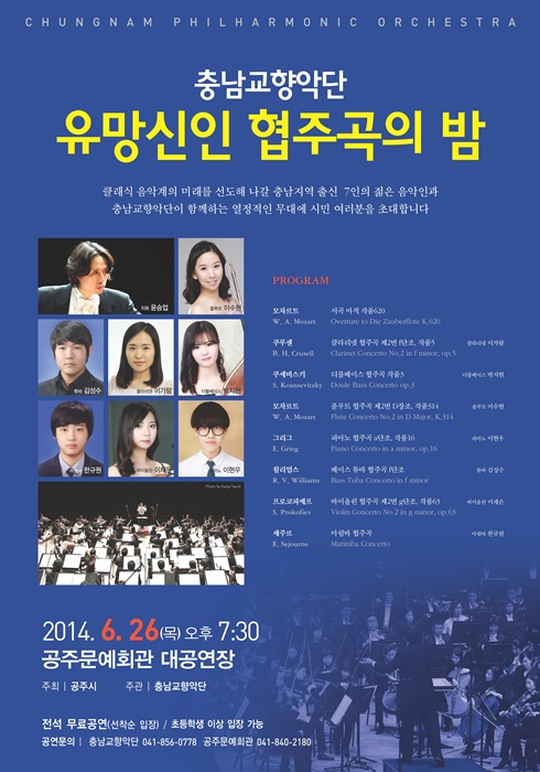 기획공연 충남교향악단<유망신인 협주곡의 밤> 공연기간2014-06-26 공연시간19:30 / 90분 공연장소대공연장 티켓정보전석 무료공연 관람등급초등학생 이상 입장가능 공연주최충남 교향악단 공연문의041-856-0778 예매하기 공지사항 공연소개 프로그램 출연진
